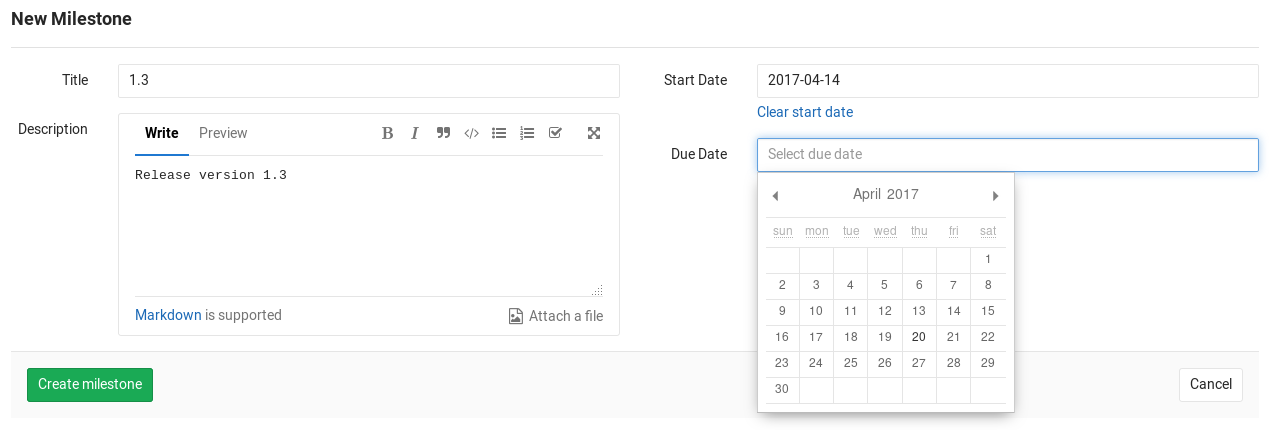 You can find the milestones page under your project's Issues ➔ Milestones. To create a new milestone, simply click the New milestone button when in the milestones page. A milestone can have a title, a description and start/due dates. Once you fill in all the details, hit the Create milestone button.